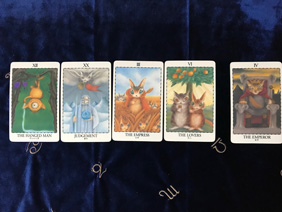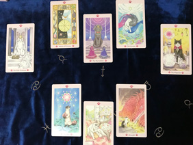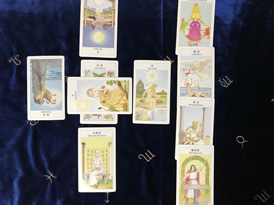 今回は大アルカナだけで展開していますが、実際は小アルカナも入りますから、リーディングには一番時間を要するスプレッドと思います。