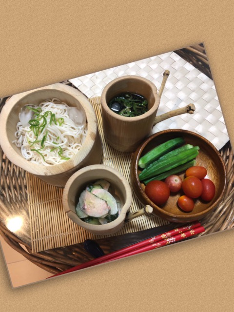 今日の夜ご飯は竹の器と素麺とキュウリ梅マヨで終了でした